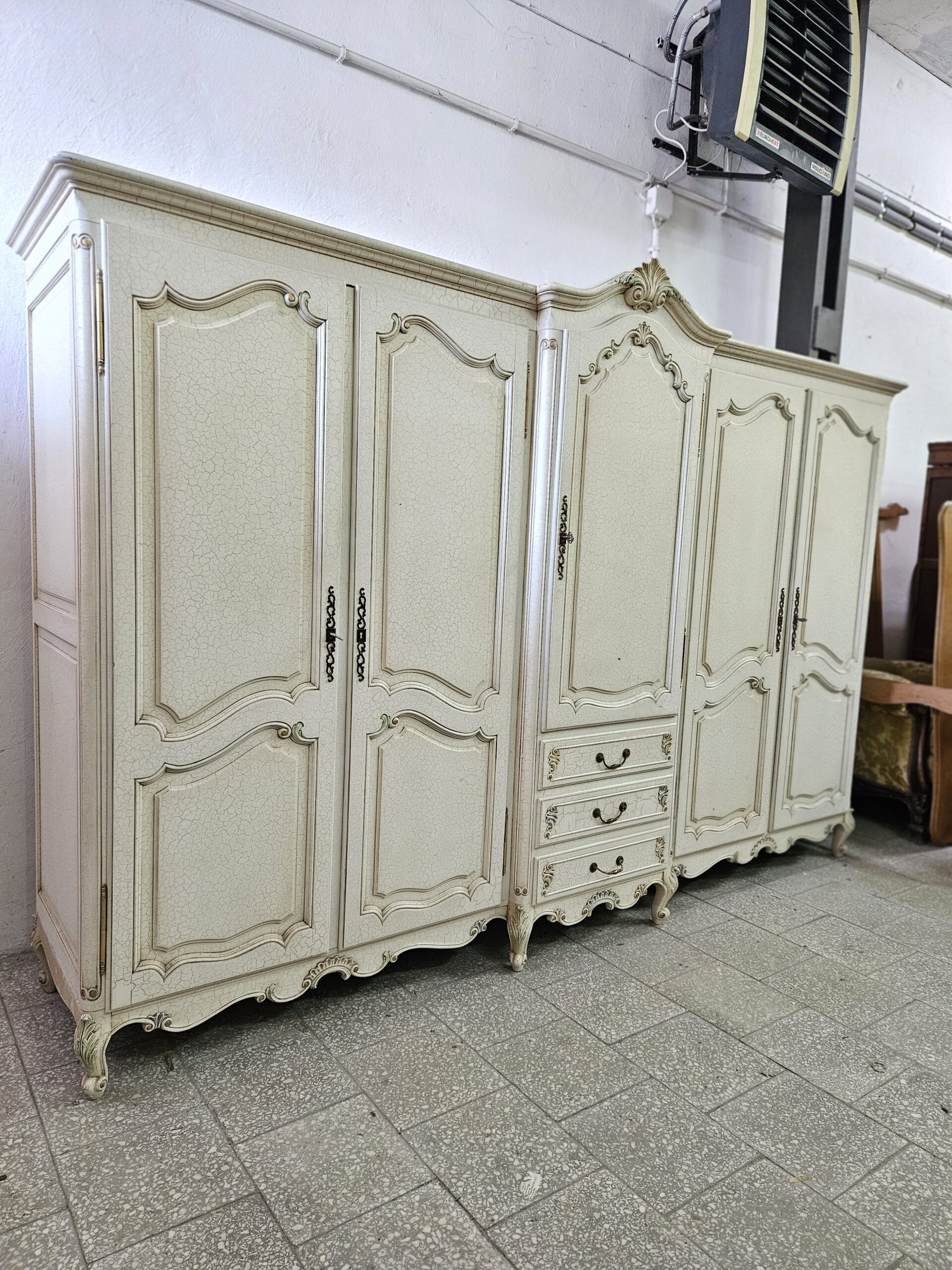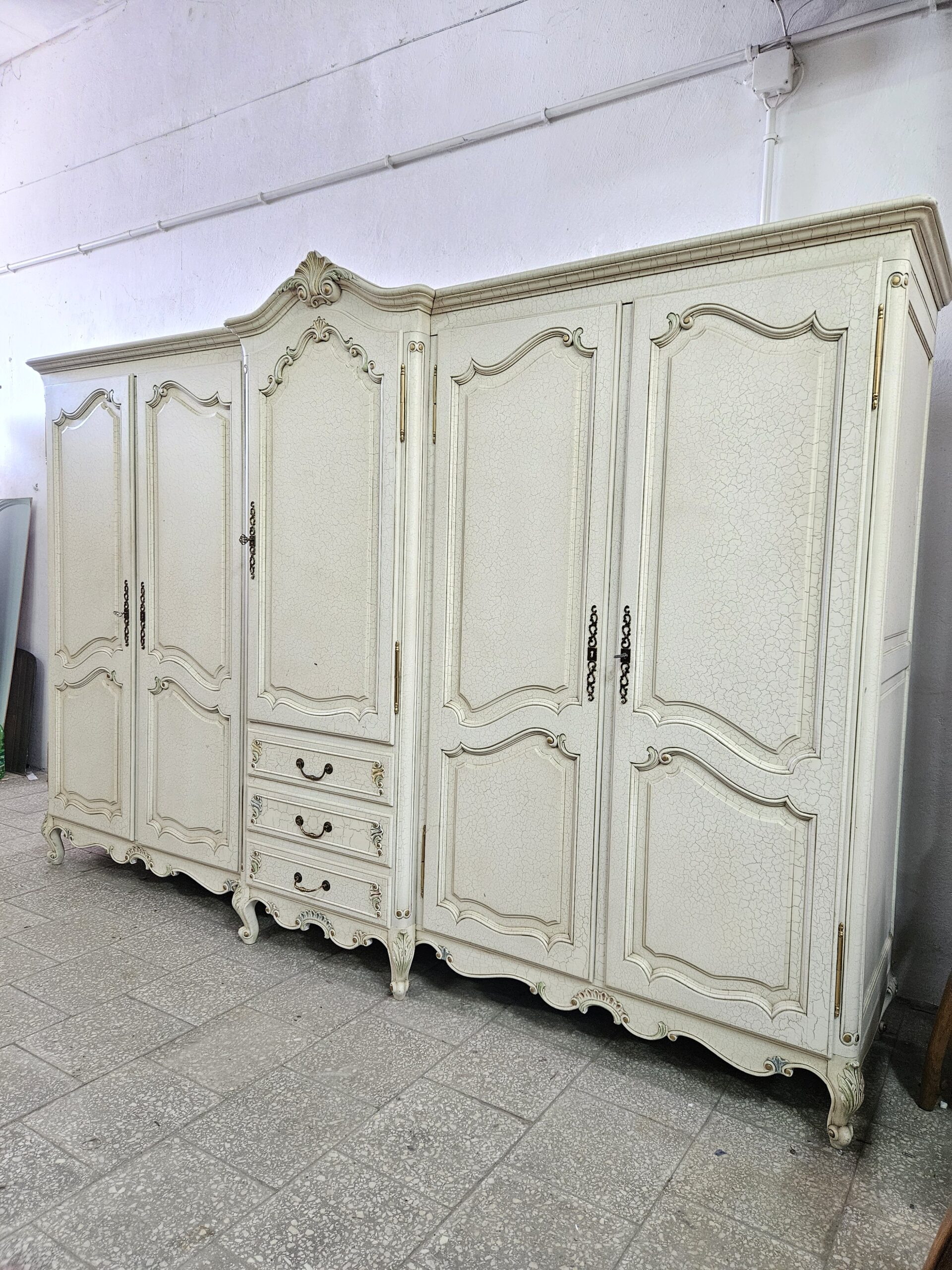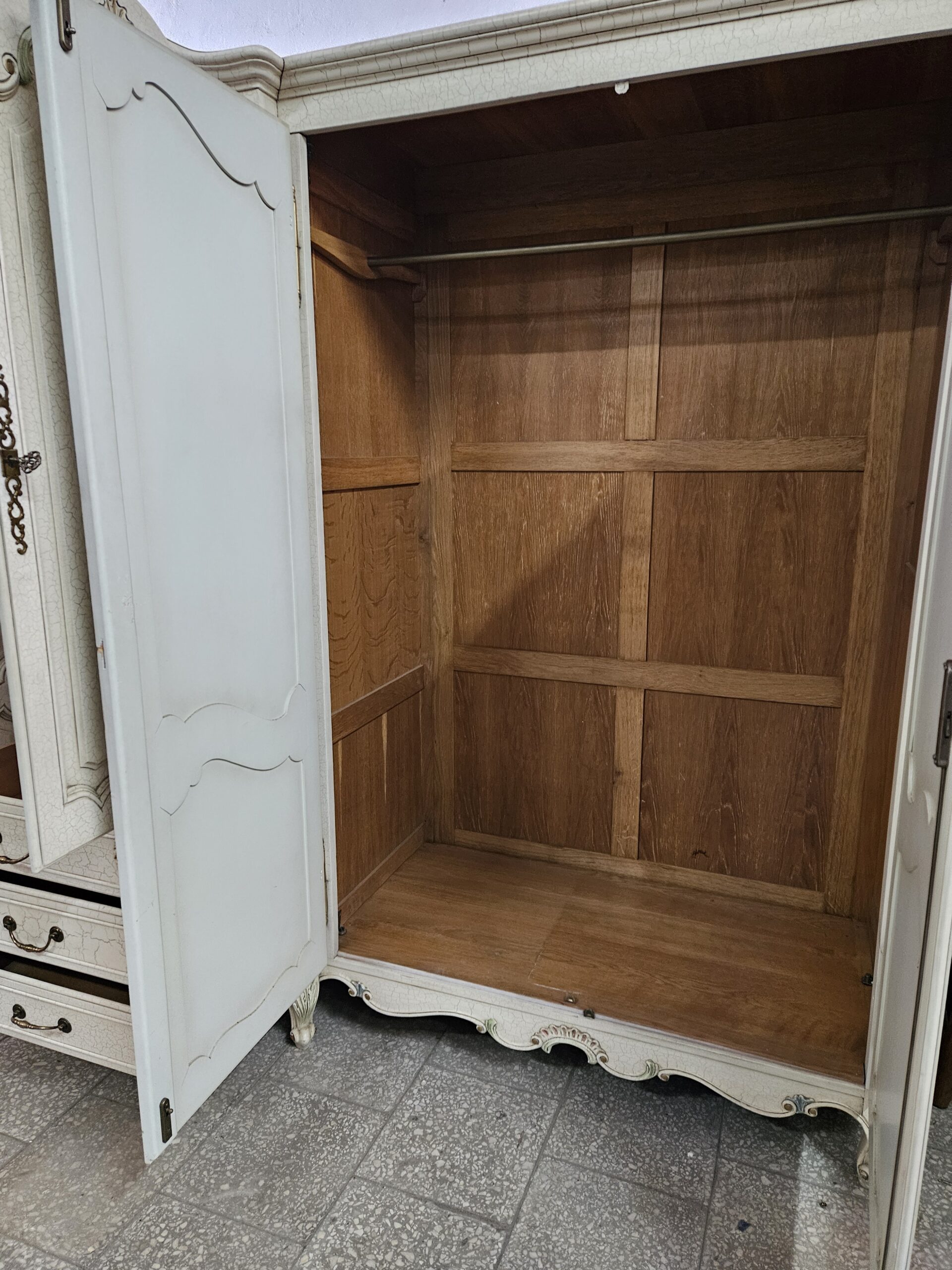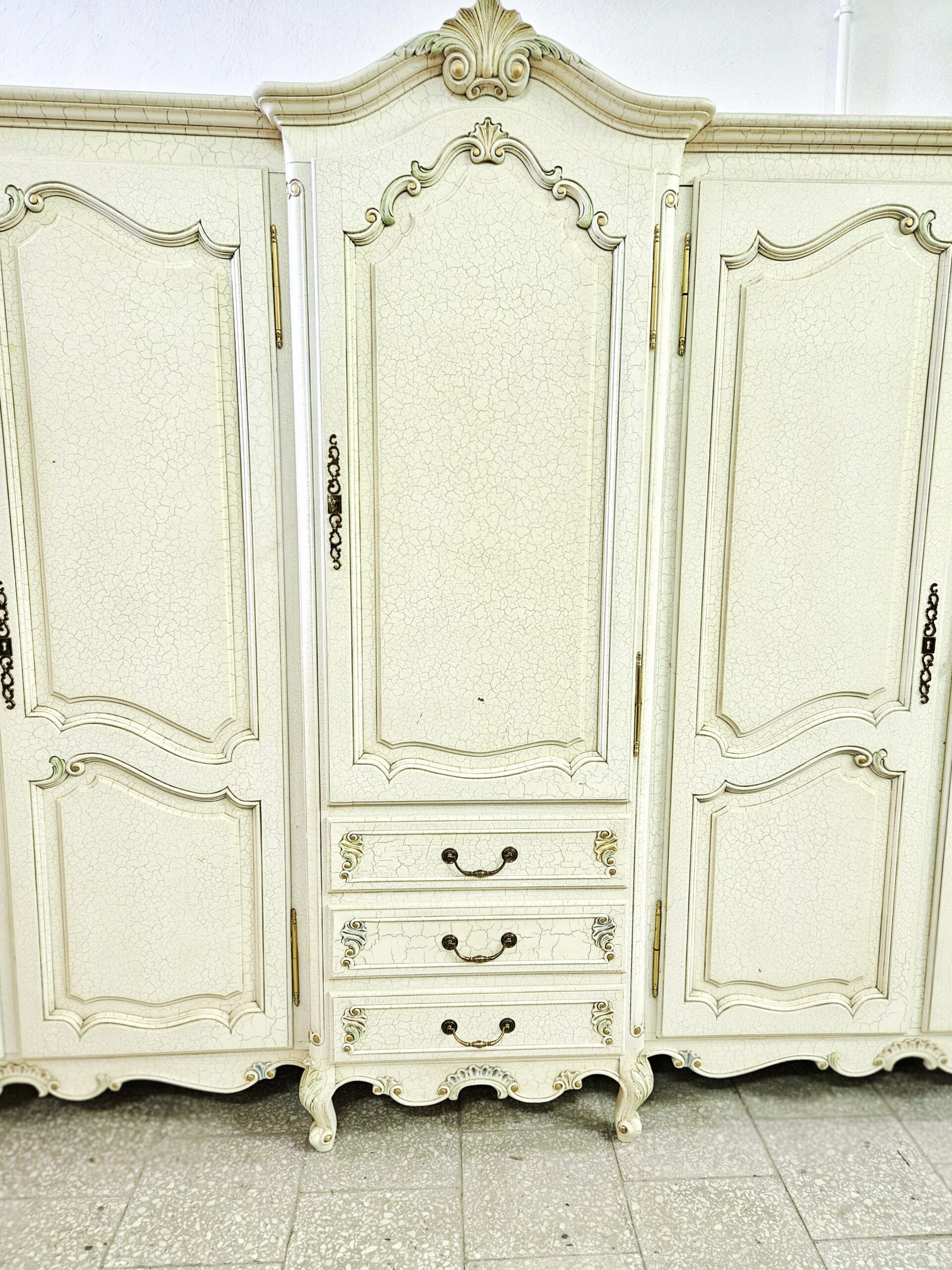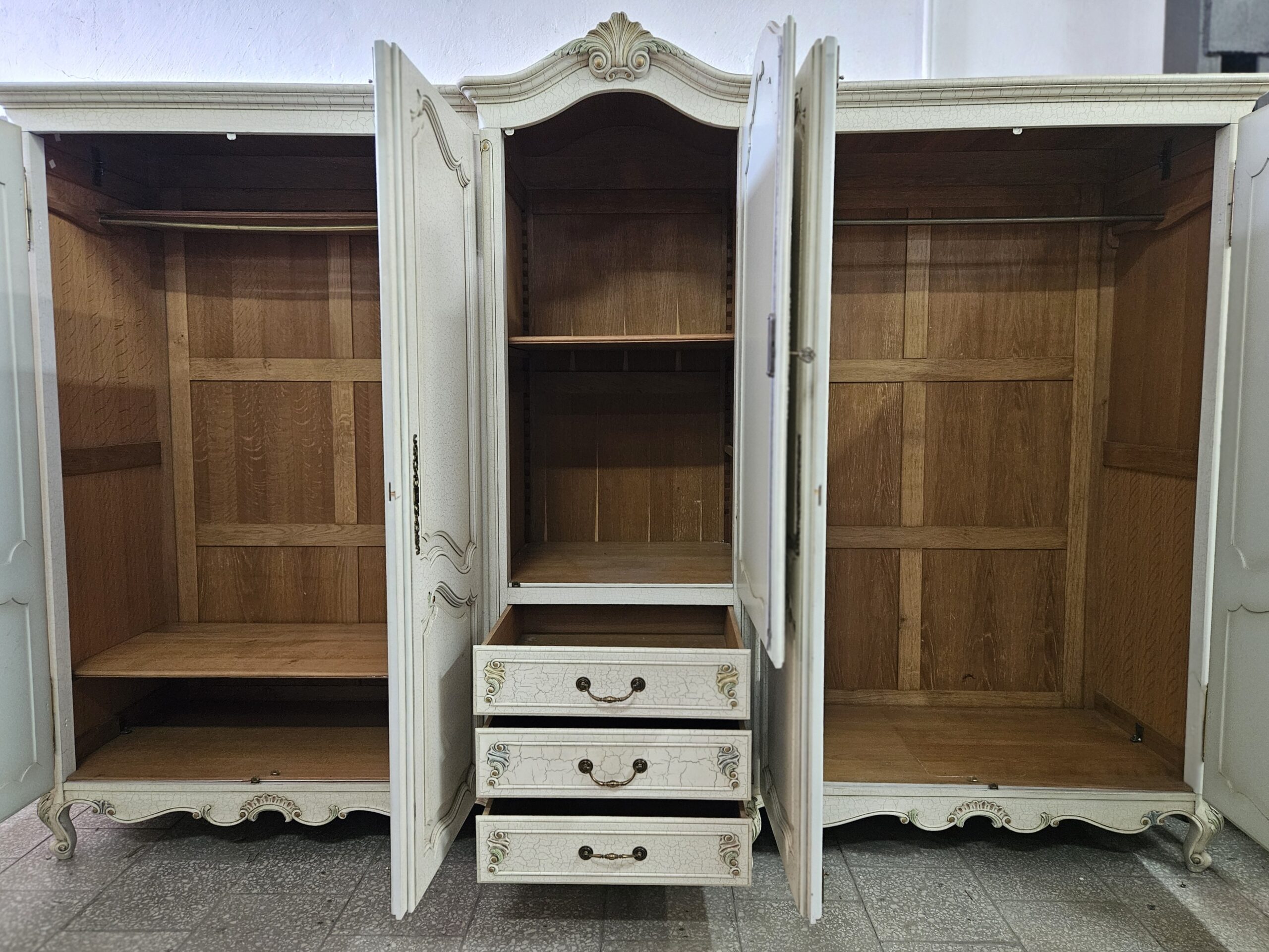 Duża francuska szafa Ludwikowska w dobrym stanie. Na środku szuflady oraz regulowana półka, po bokach drążki na wieszaki. Rozkręcana do transportu. Możliwość dostawy lub odbiór w naszym magazynie w Nowym Sączu po wcześniejszym uzgodnieniu. Wnoszenie i montaż we własnym zakresie