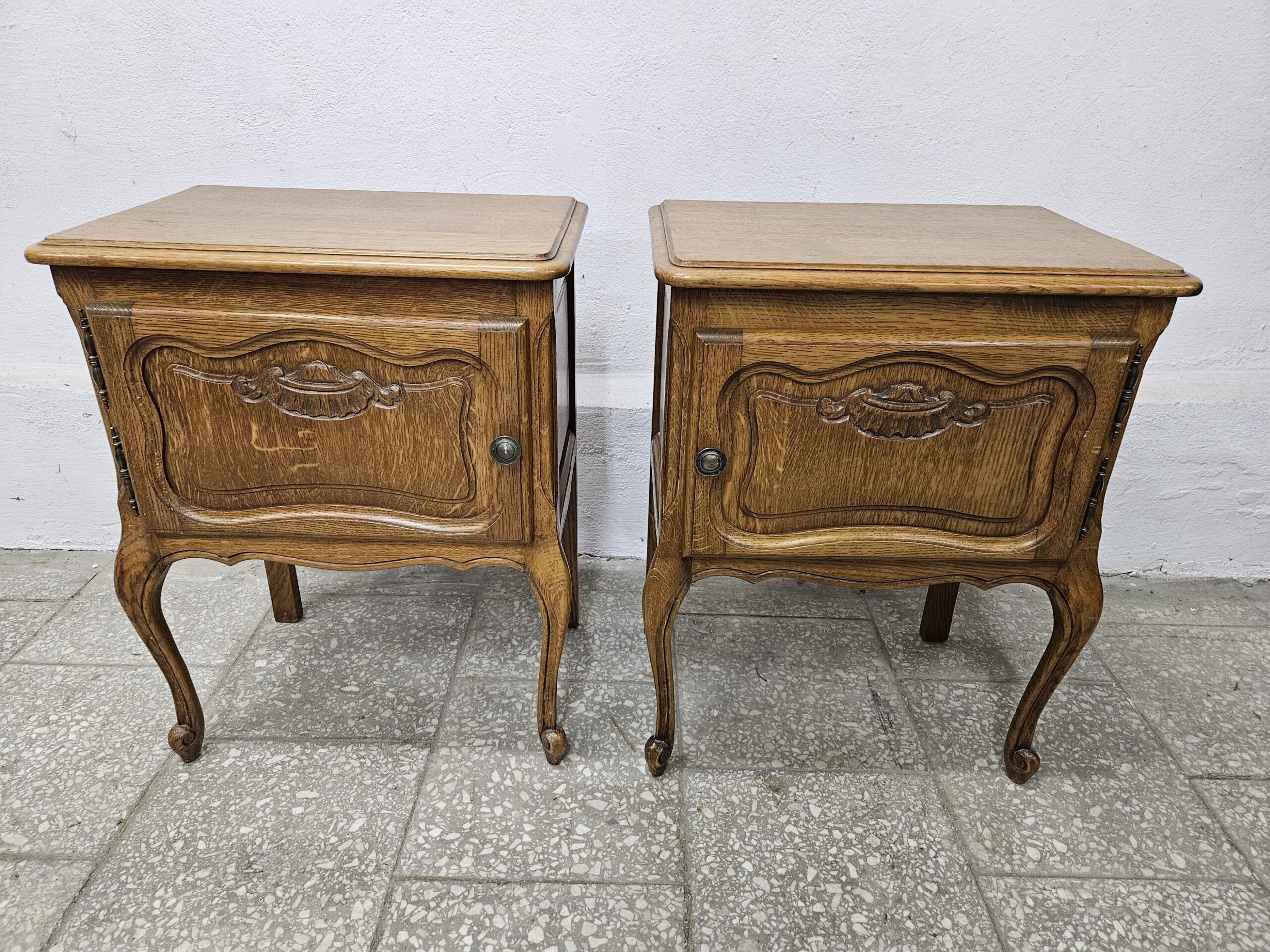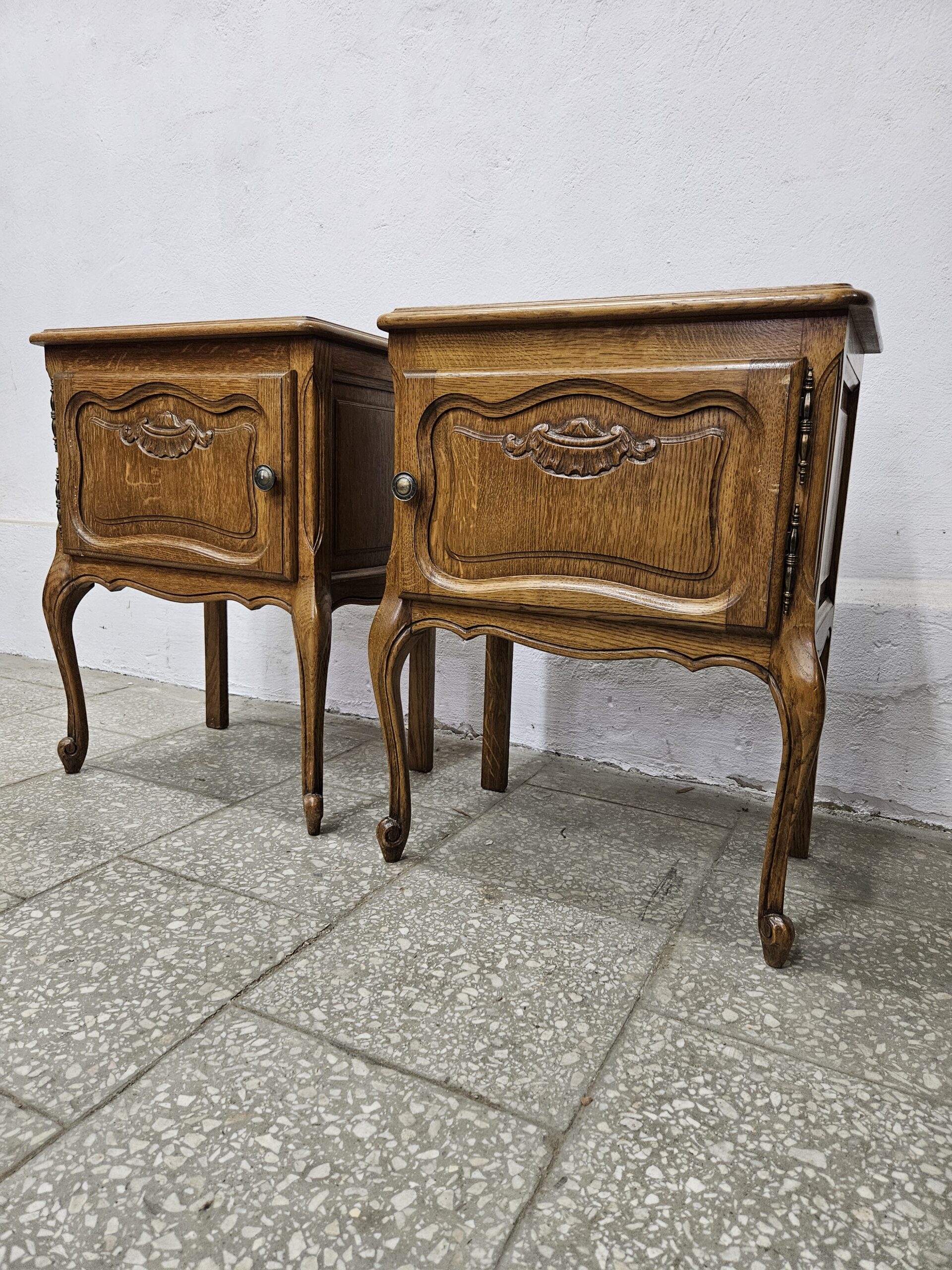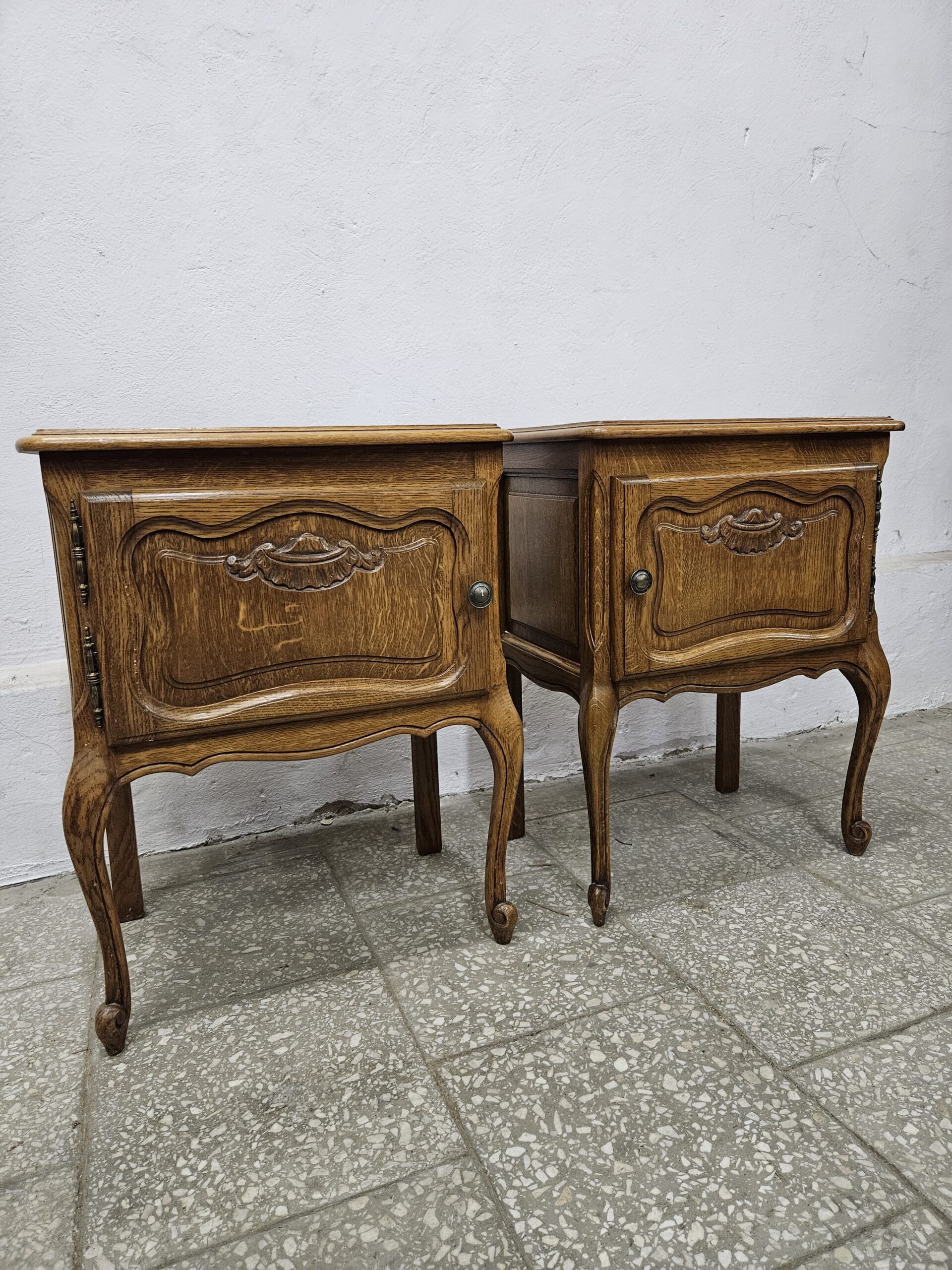 Dwa ładne stoliki nocne w stylu francuskim. Mają piękne rzeźbione detale i elegancki wygląd. Nadają się jako praktyczne i dekoracyjne elementy do sypialni lub salonu. Nieznaczne ślady użytkowania na blatach. Możliwość dostawy lub odbiór w naszym magazynie w Nowym Sączu po wcześniejszym uzgodnieniu