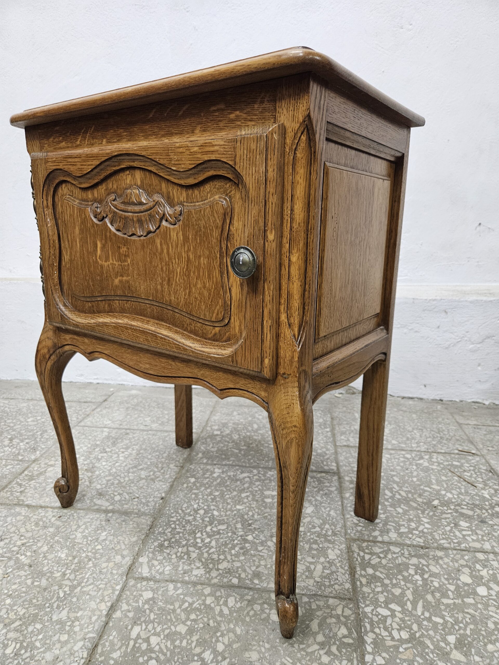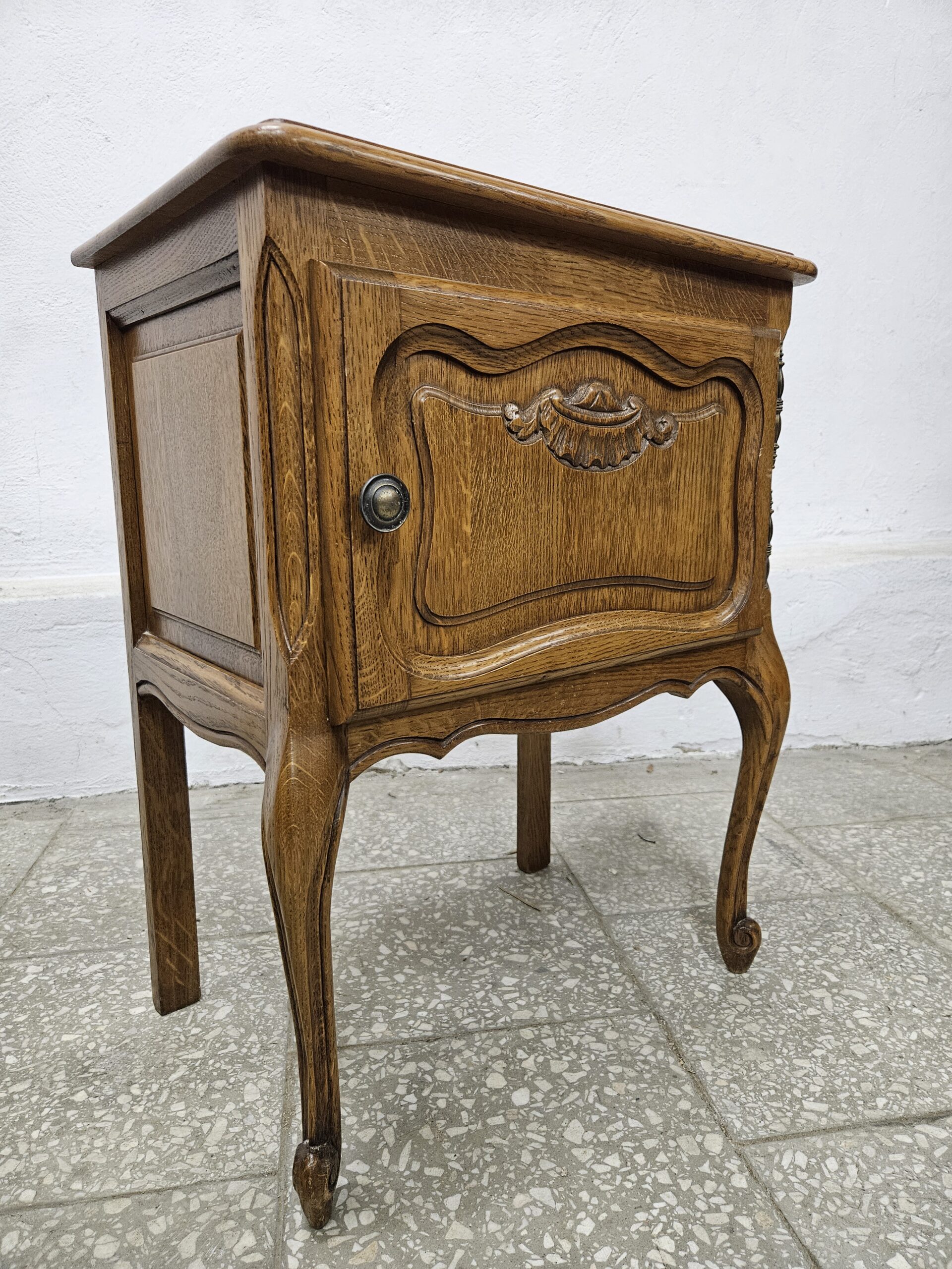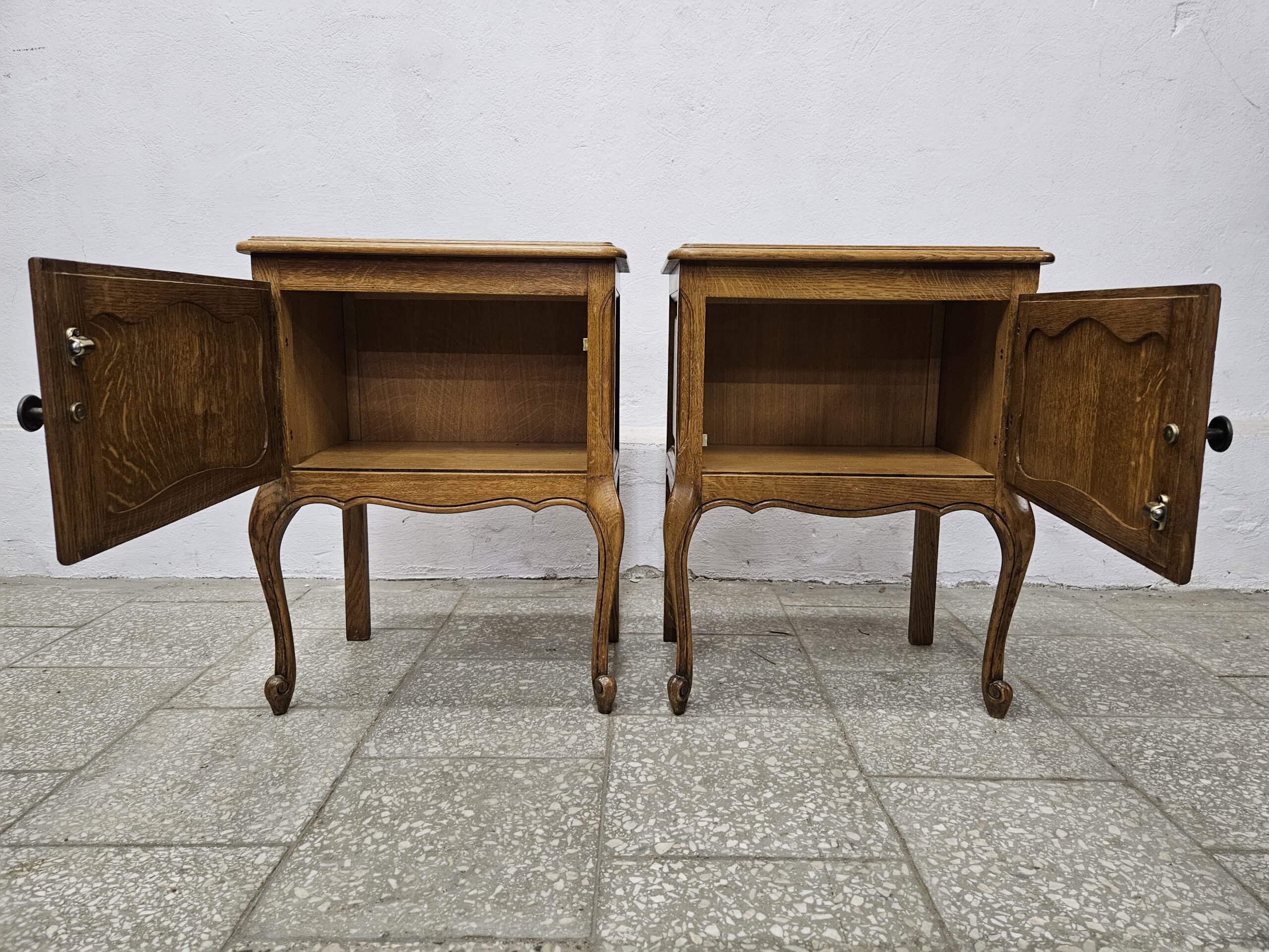 Dwa ładne stoliki nocne w stylu francuskim. Mają piękne rzeźbione detale i elegancki wygląd. Nadają się jako praktyczne i dekoracyjne elementy do sypialni lub salonu. Nieznaczne ślady użytkowania na blatach. Możliwość dostawy lub odbiór w naszym magazynie w Nowym Sączu po wcześniejszym uzgodnieniu
