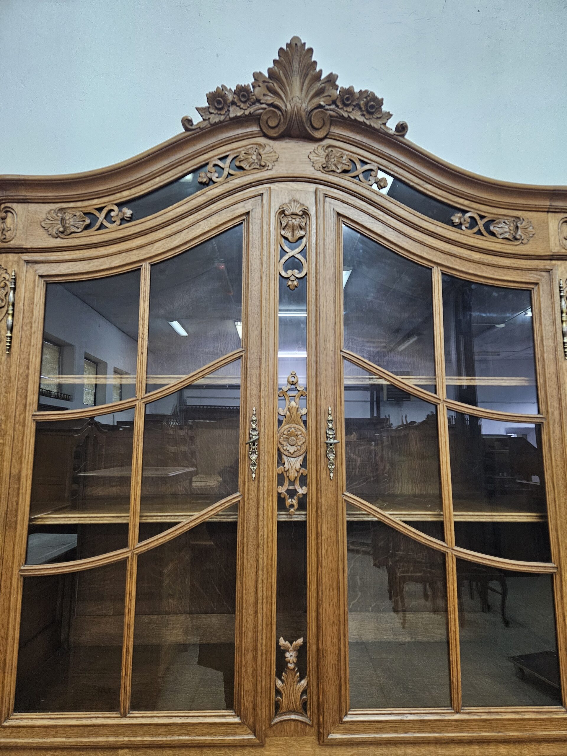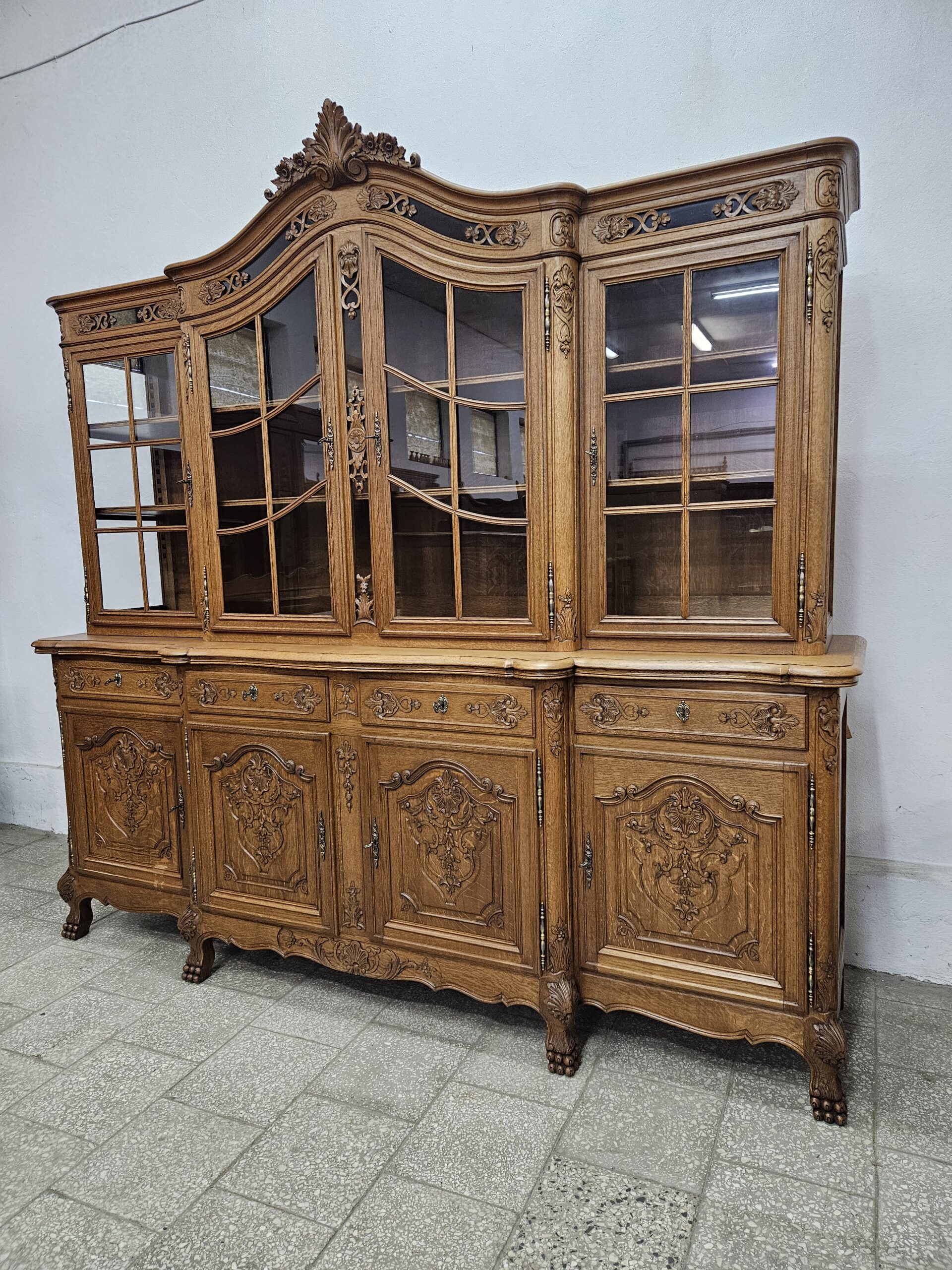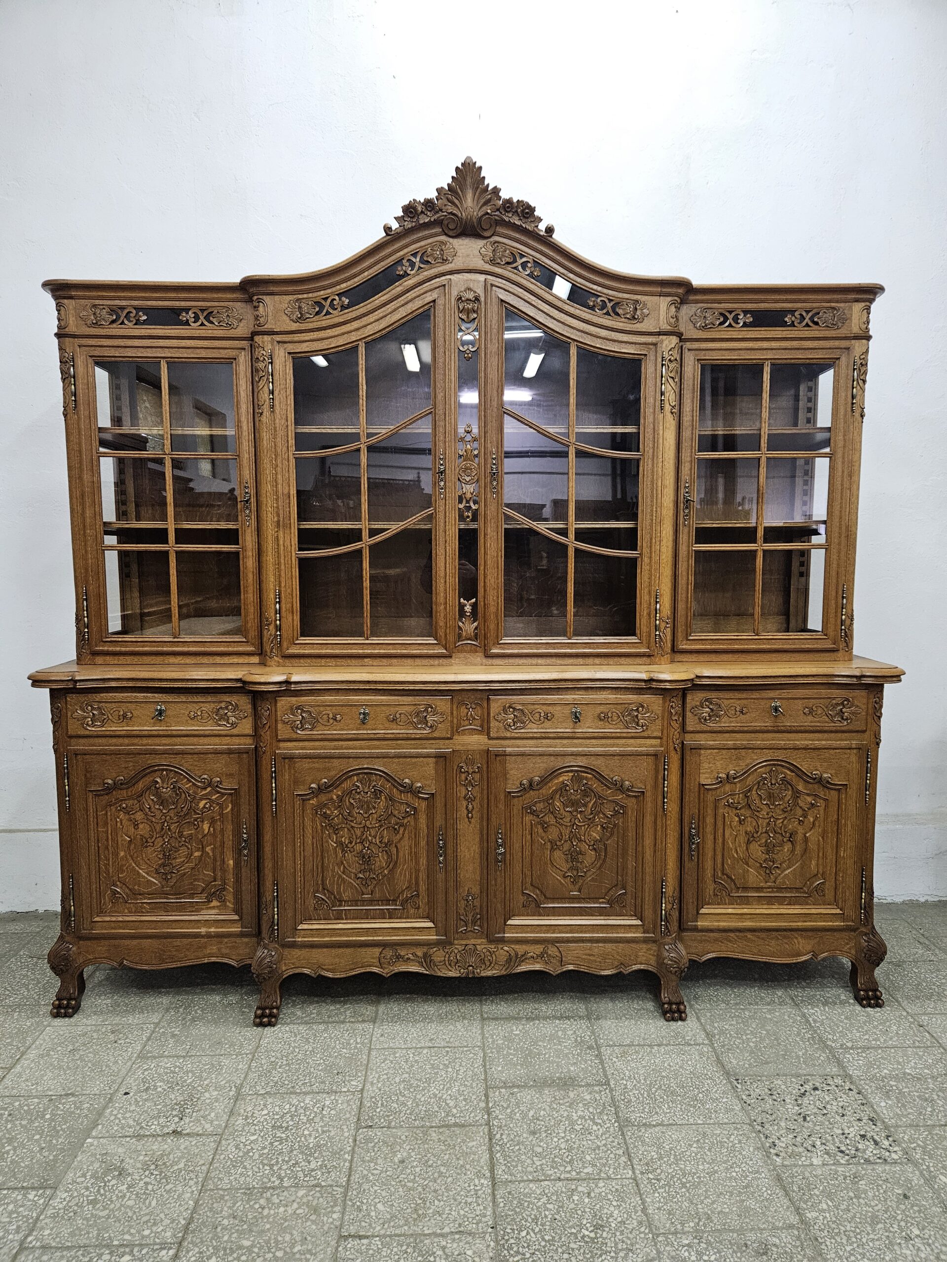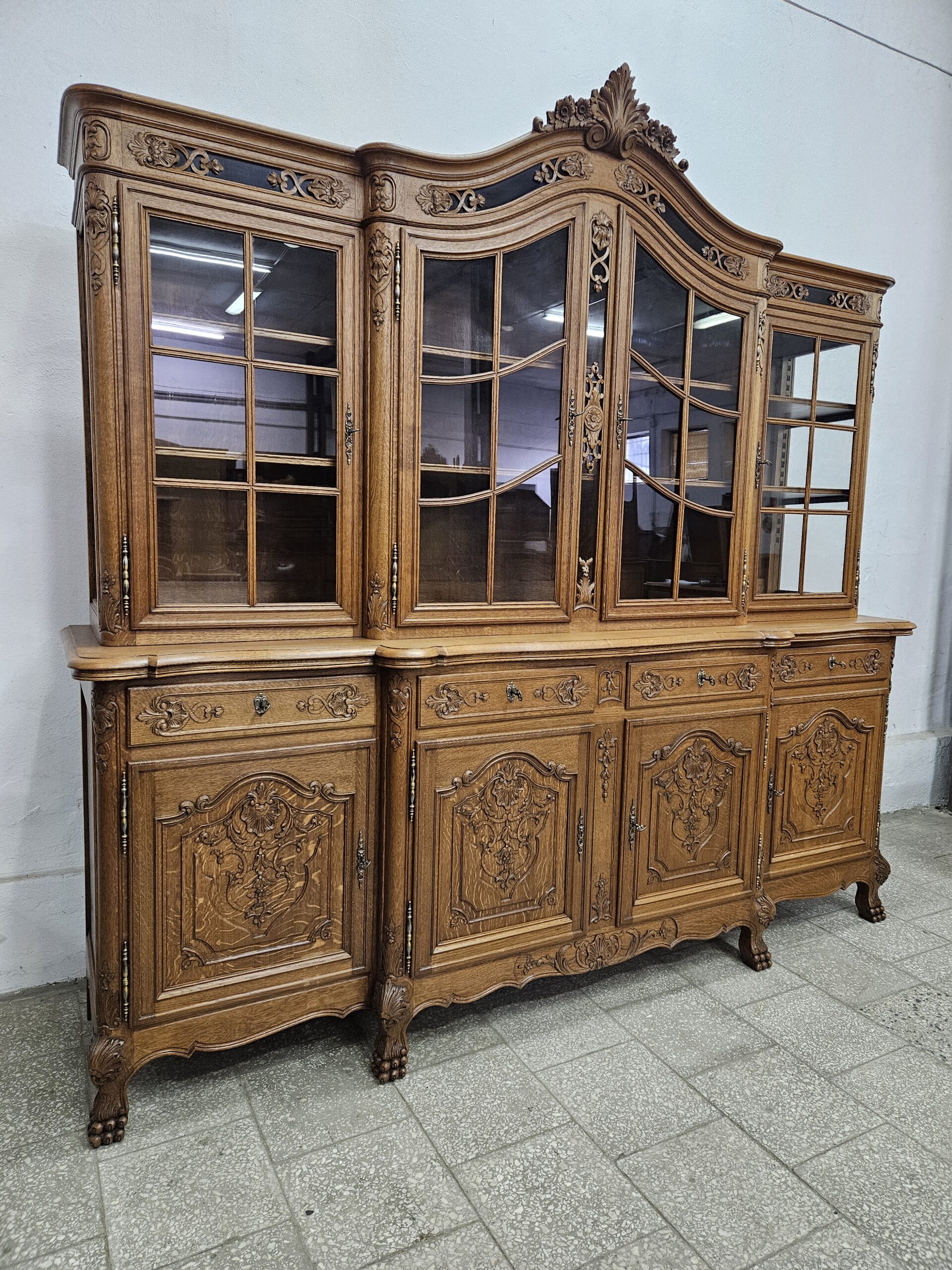 Stylowy, kredens w stylu francuskim Ludwika XV. Wykonany z drewna dębowego, bogato zdobiony rzeźbionymi motywami. Bardzo ciężki i stabilny. Dzieli się na dwie części do transportu. Górna część oszklona z trzech stron, idealna jako biblioteczka na książki lub do ekspozycji szkła ,porcelany lub alkoholi.