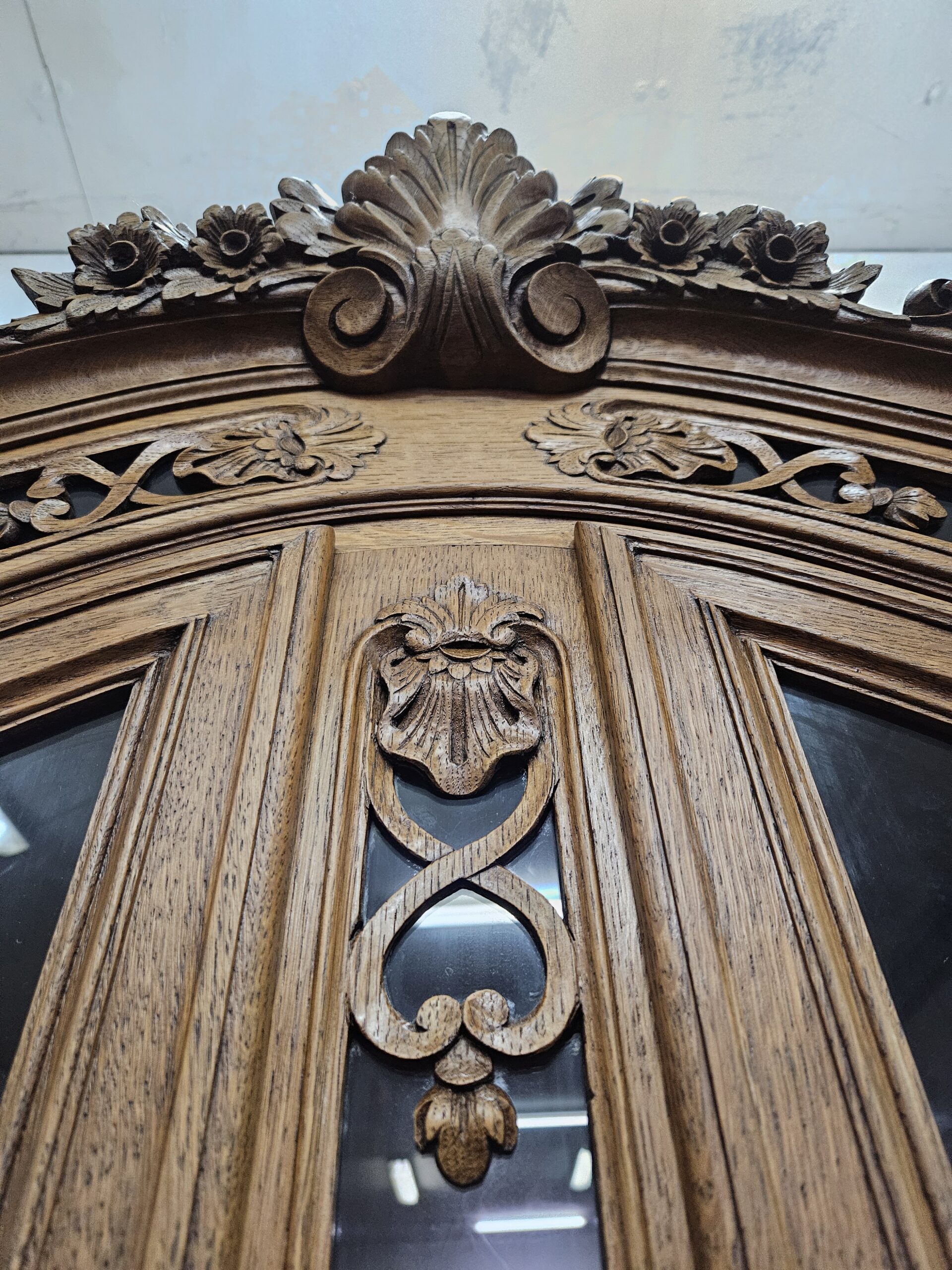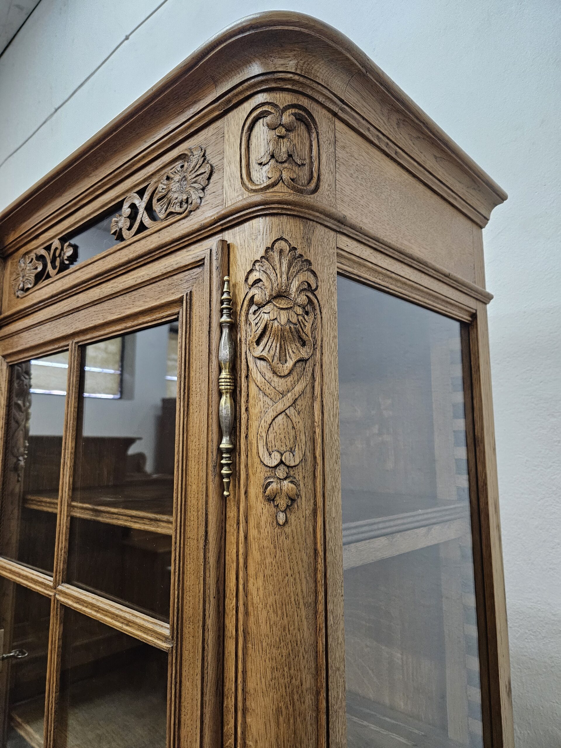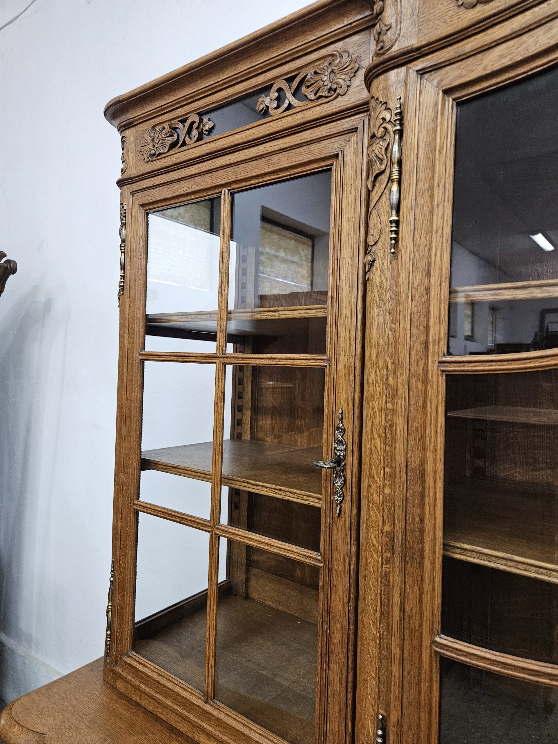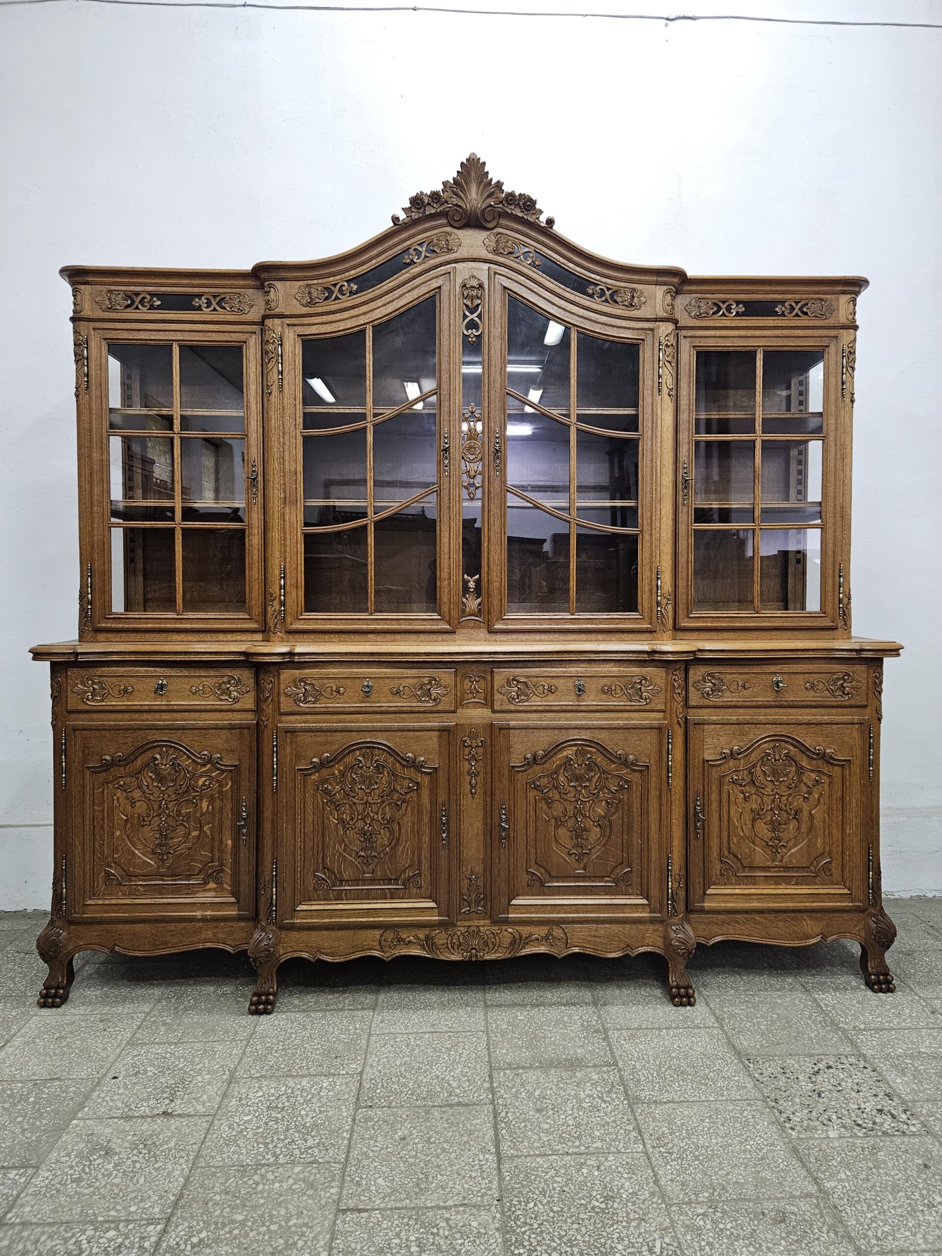 Stylowy, kredens w stylu francuskim Ludwika XV. Wykonany z drewna dębowego, bogato zdobiony rzeźbionymi motywami. Bardzo ciężki i stabilny. Dzieli się na dwie części do transportu. Górna część oszklona z trzech stron, idealna jako biblioteczka na książki lub do ekspozycji szkła ,porcelany lub alkoholi.