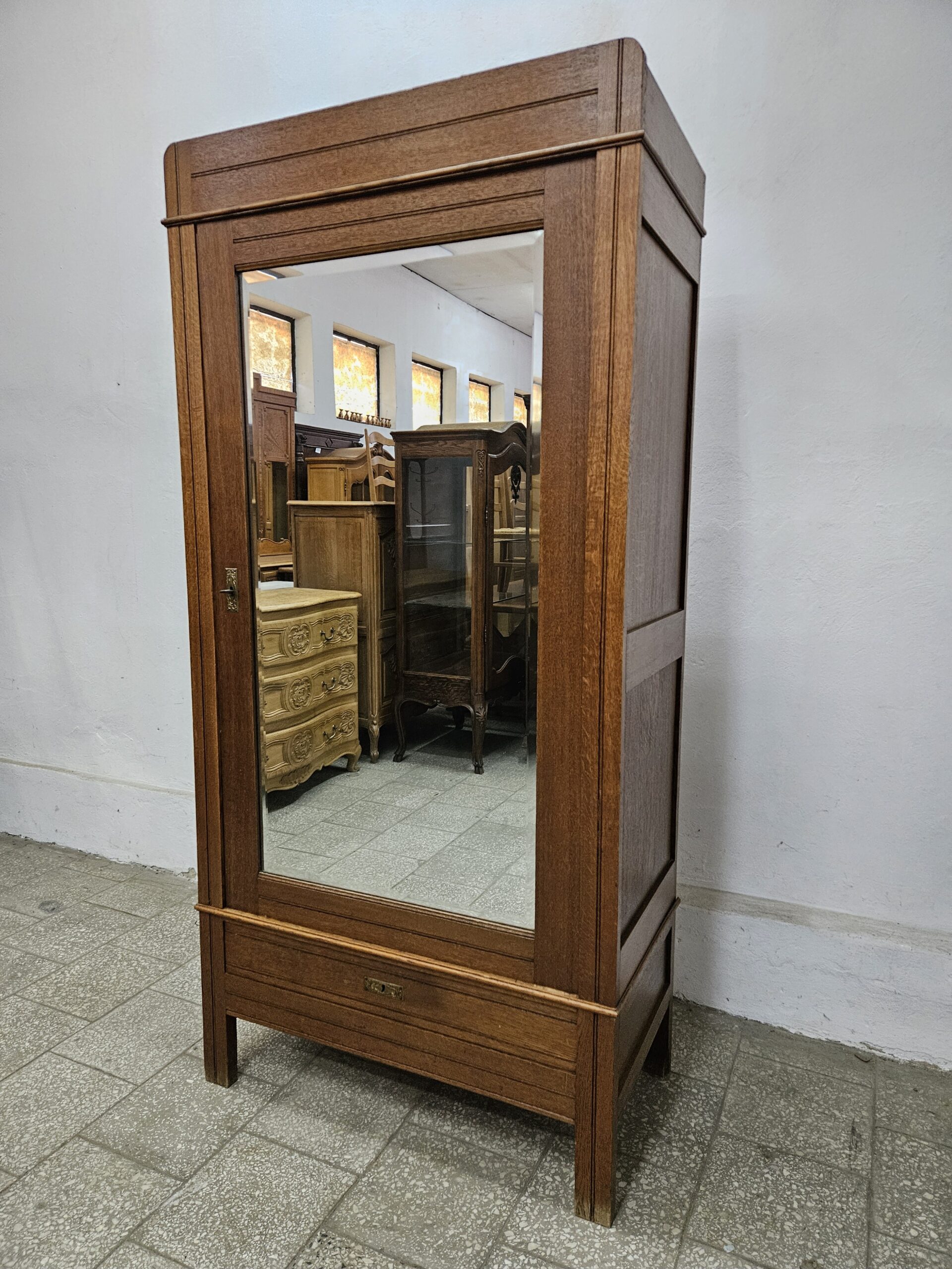 Stara szafa secesyjna ,bieliźniarka z półkami i lustrem. Szafa około 100letnia,ale w dobrym stanie. Wewnątrz 3 półki wyłożone papieram, który można łatwo usunąć . Brak zamka. Lustro Ładne,bez plamek i uszkodzeń . Szafa jest rozkładana do transportu . Możliwość dostawy lub odbiór w naszym magazynie w Nowym Sączu ul Węgierska 211a po wcześniejszym uzgodnieniu.