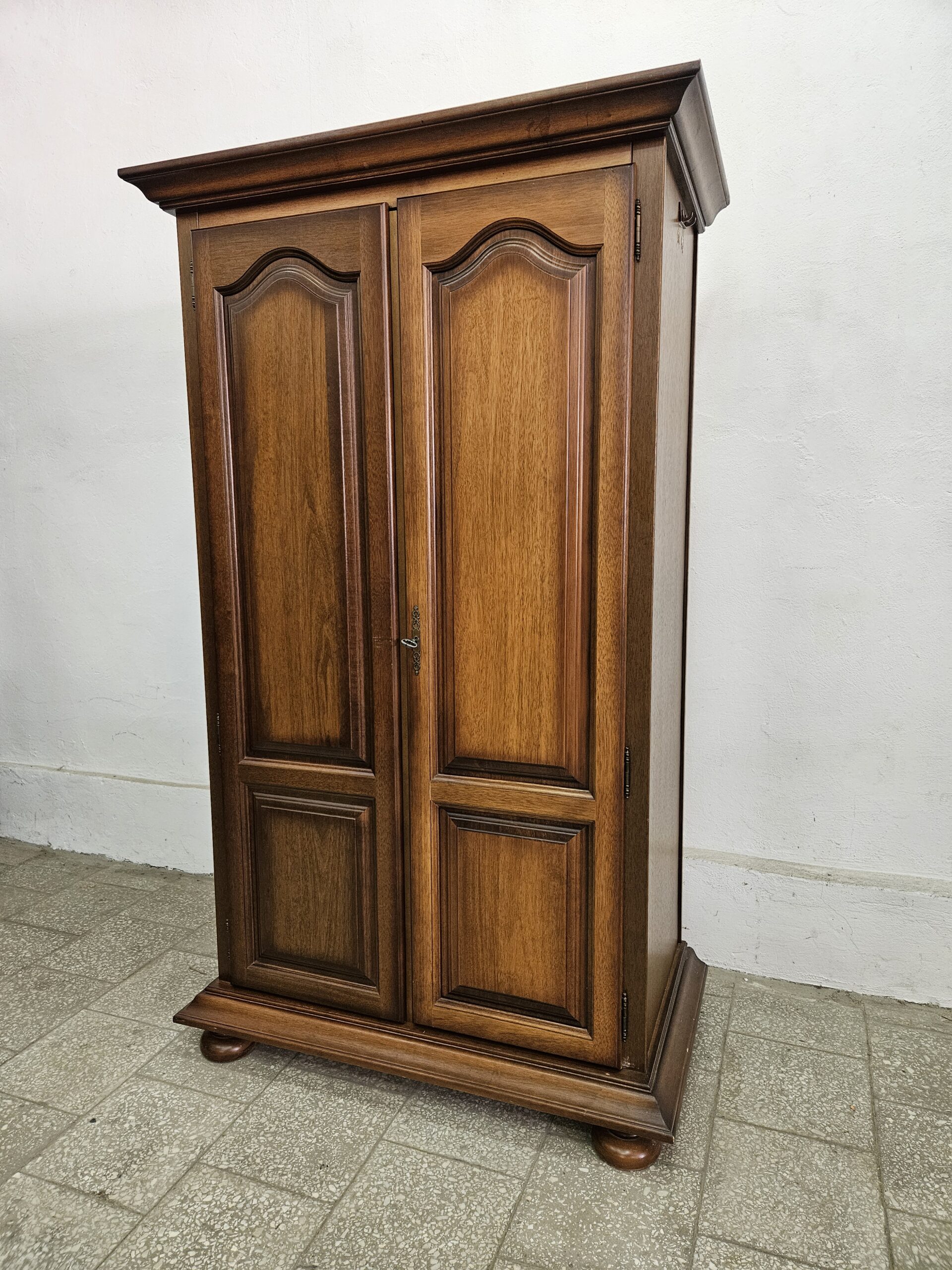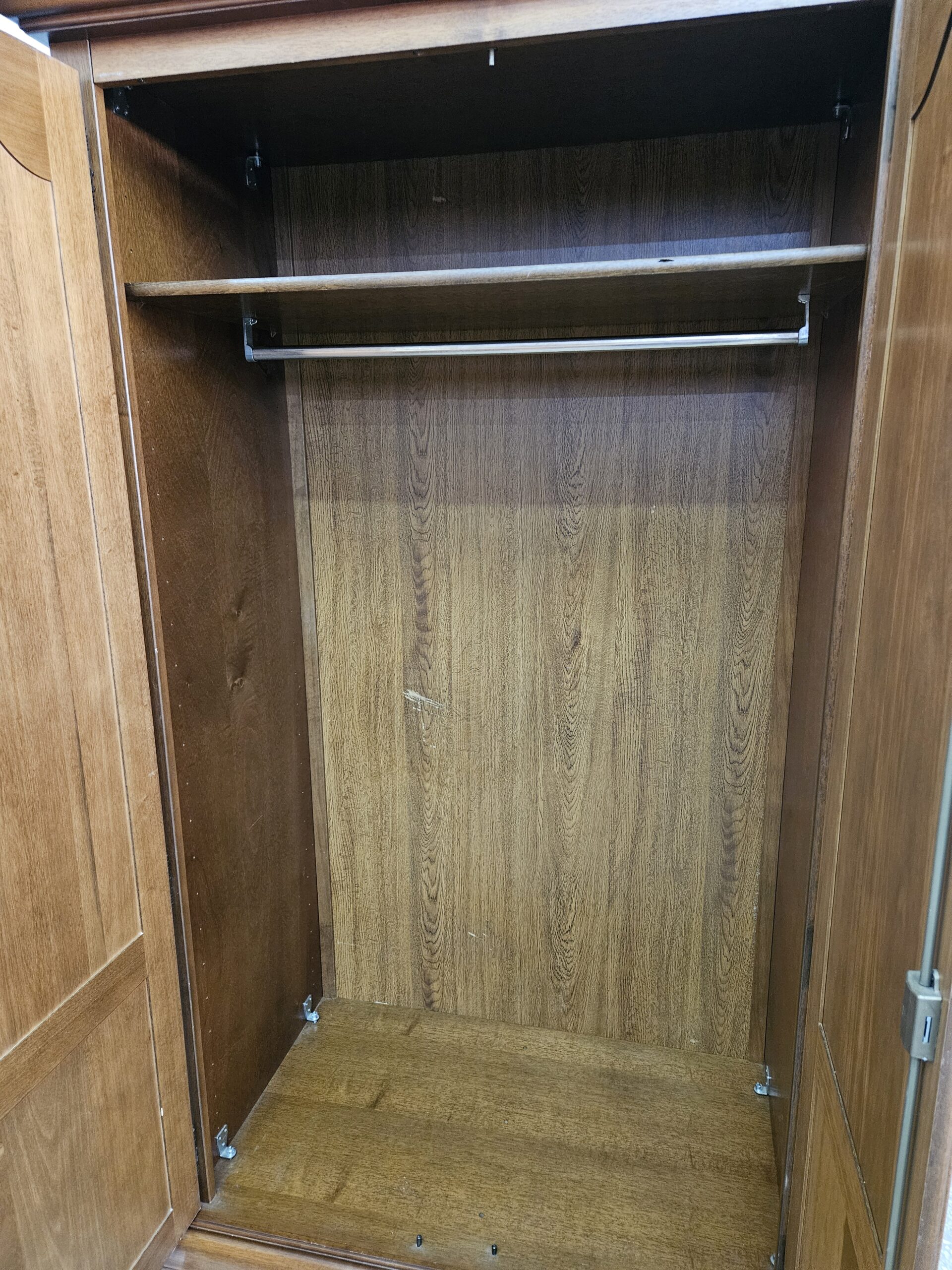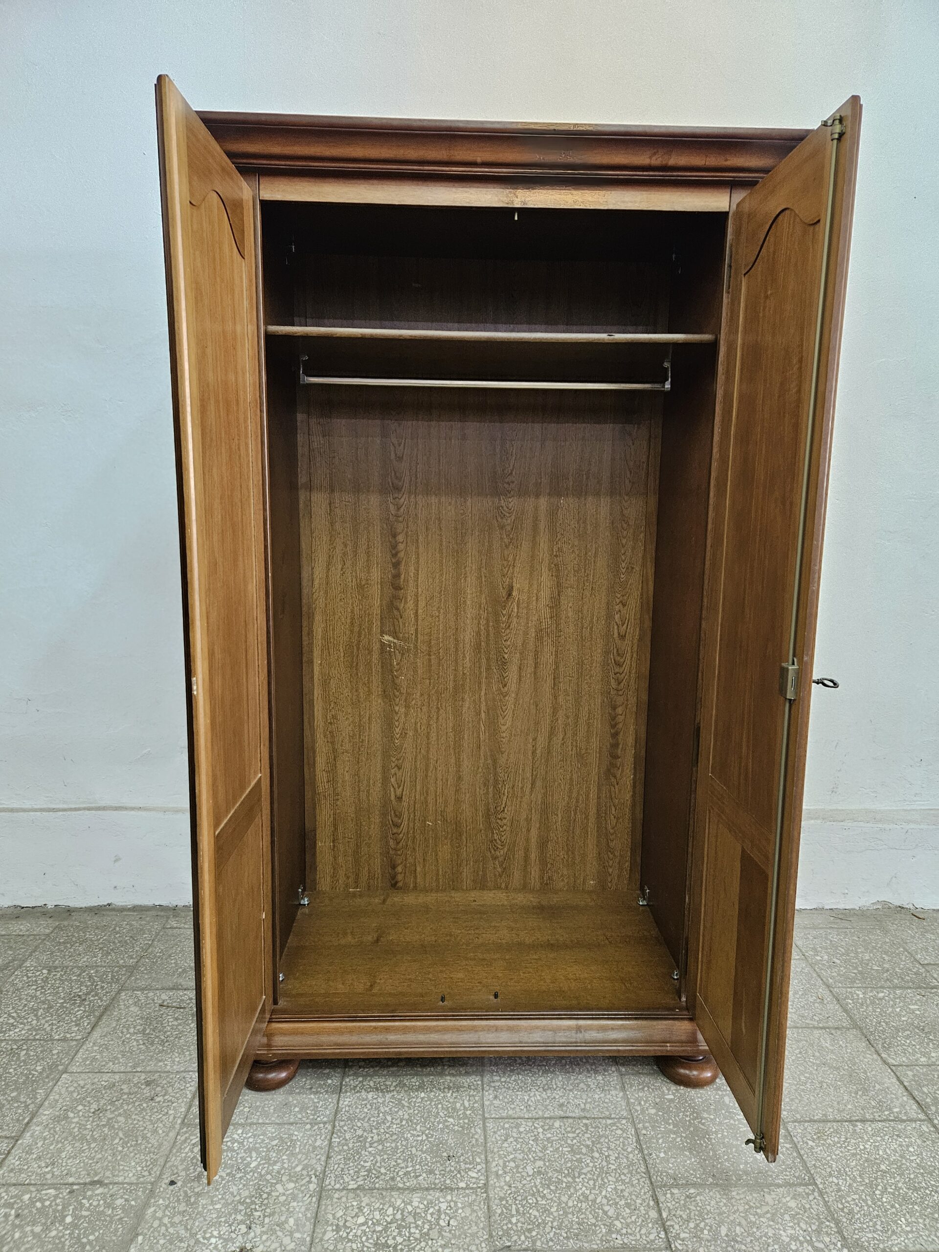 Stylowa szafa z drążkiem na wieszaki. Mebel w dobrym stanie, nadające się do użytku. Doskonałe rozwiązanie do przechowywania odzieży i akcesoriów. Klucze w komplecie, zamki sprawne. Szafę można rozkręcić do transportu. Wnętrze czyste bez zapachów. Możliwość dostawy lub odbiór w naszym magazynie w Nowym Sączu po wcześniejszym uzgodnieniu. W innym ogłoszeniu druga taka sama szafa z półkami i wieszakiem na ubrania.