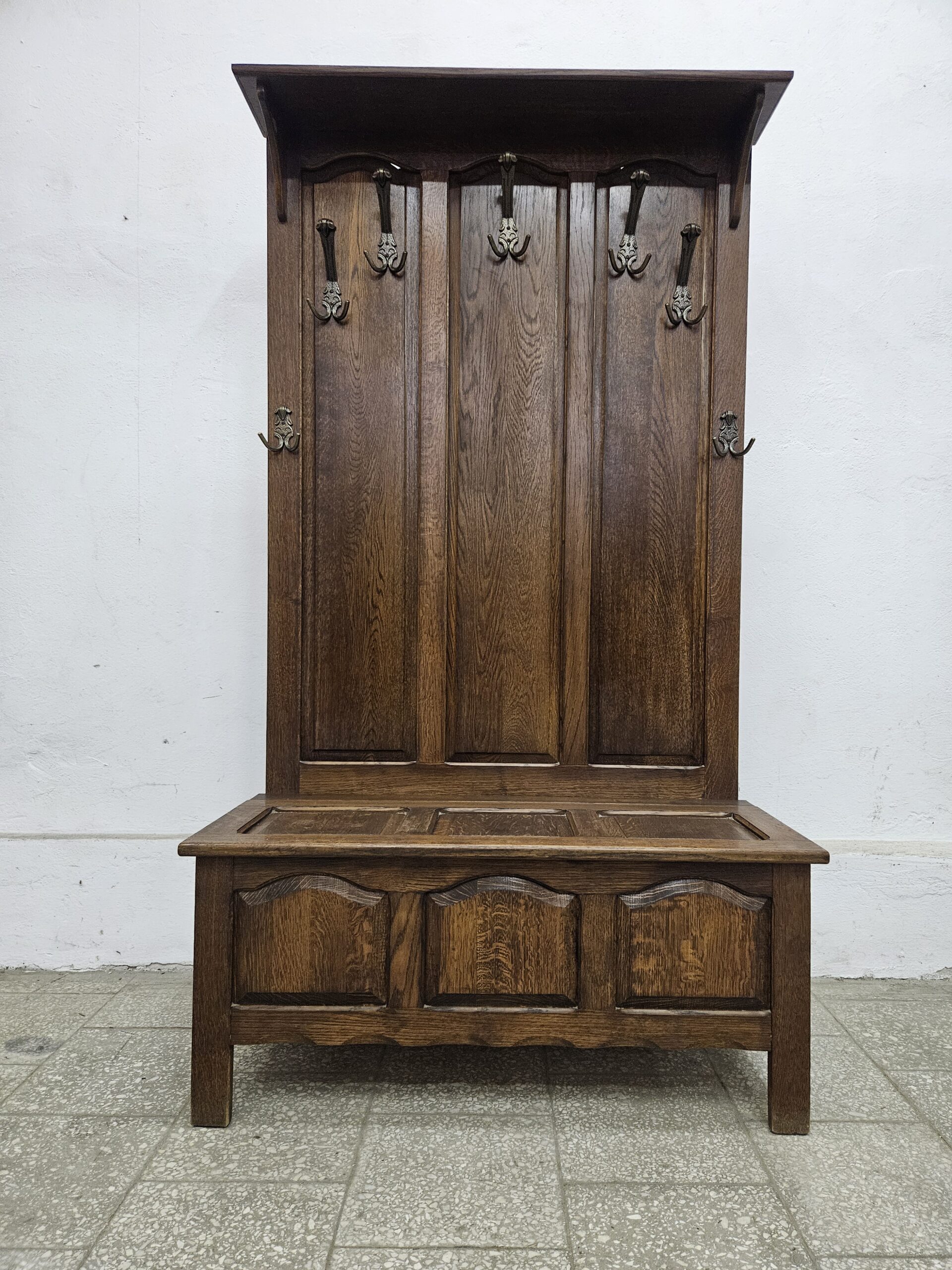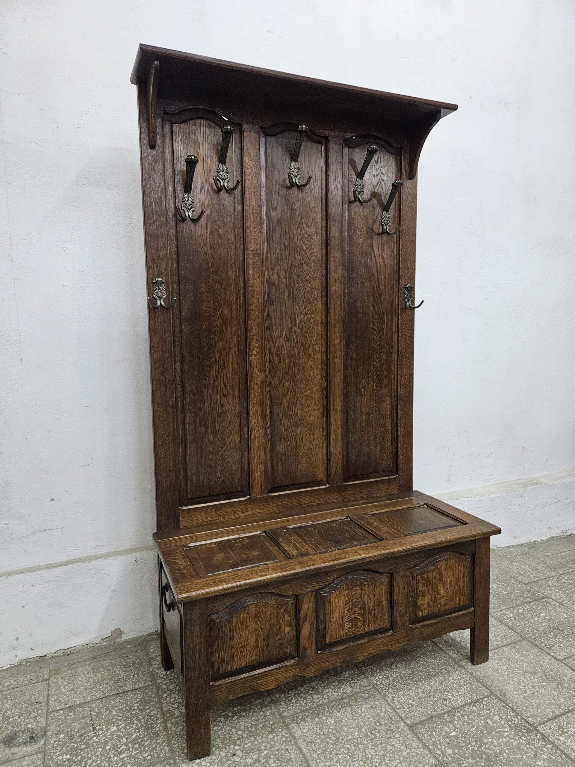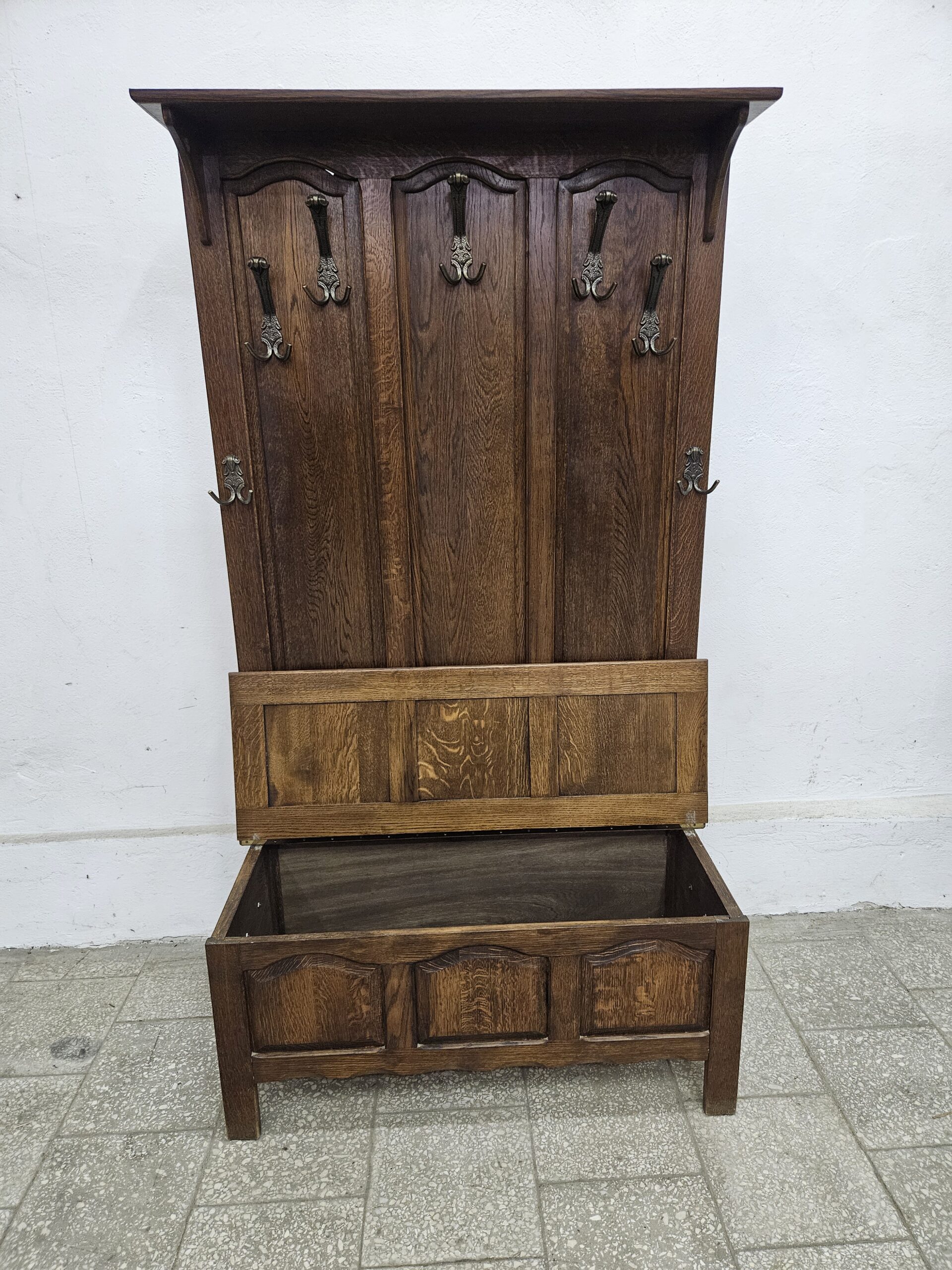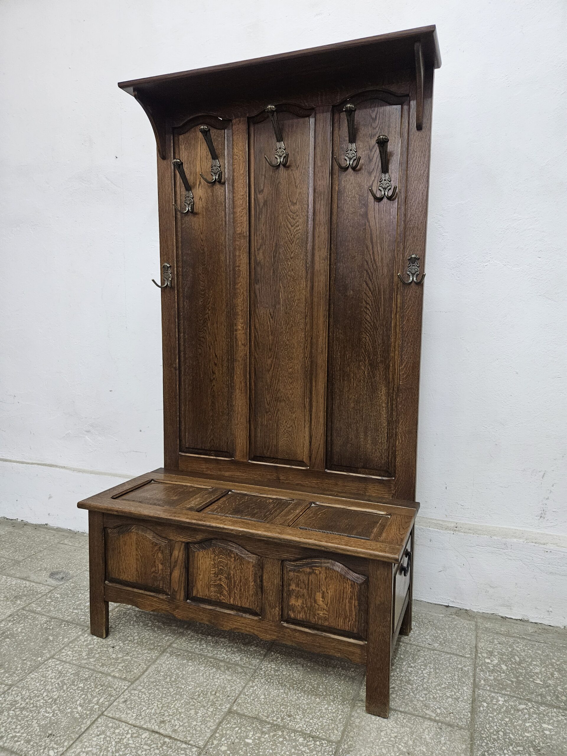 Stylowy wieszak z otwieranym siedziskiem, do przedpokoju lub garderoby. Wykonany z drewna w ciemnym kolorze, posiada miejsce na przechowywanie rzeczy. Idealny do urządzenia przestrzeni w korytarzu lub sypialni. Możliwość dostawy lub odbiór w naszym magazynie w Nowym Sączu ul Węgierska 211a po wcześniejszym uzgodnieniu